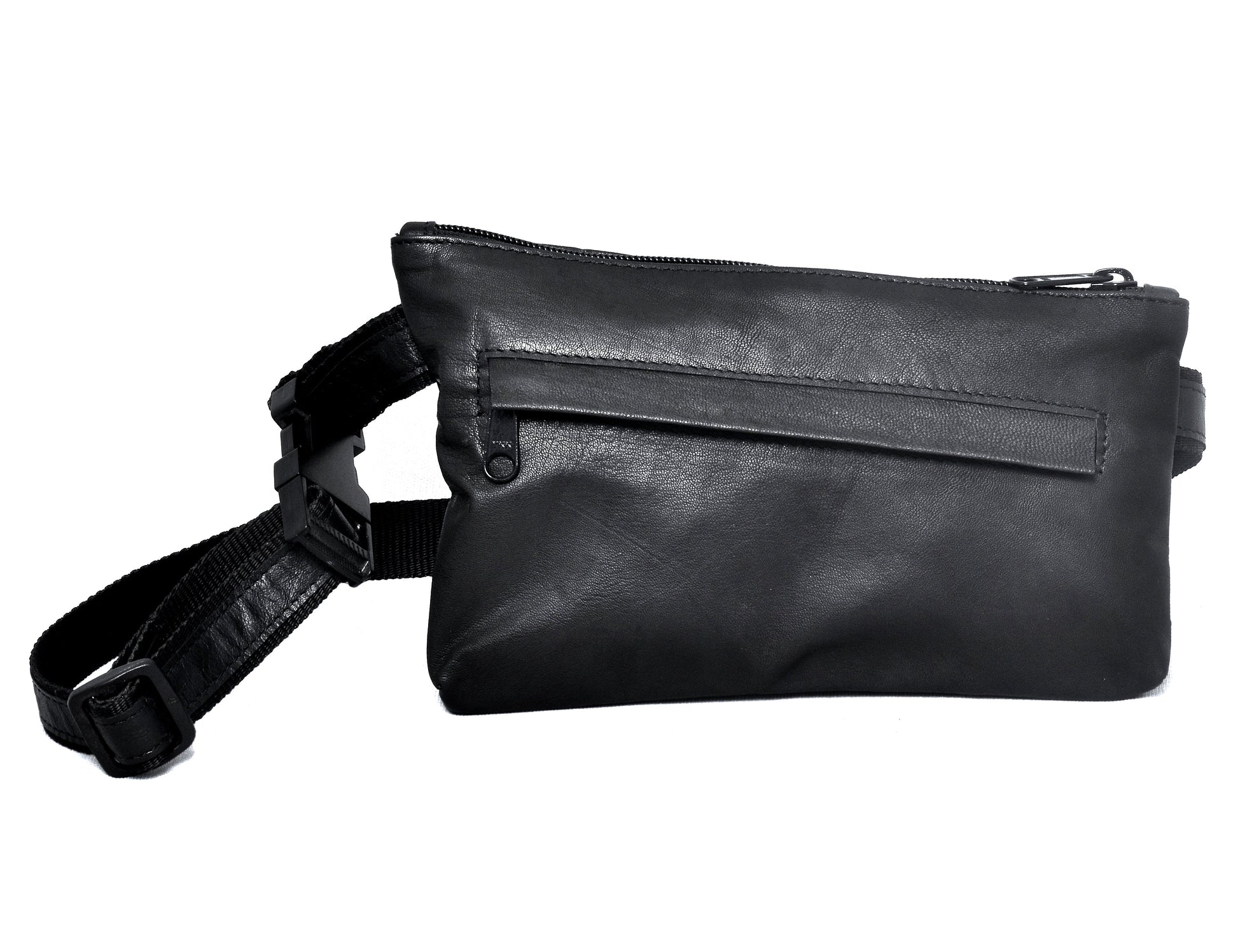 Anoir by amal kiran jana Infinite Whirling Waist Pouch is asymmetric in shape and made out of leather. This unisex pouch has comfortable adjustable waist strap along with top zipper opening and a hidden back zipper, all lined with soft cotton canvas. This collection supports slow fashion and anti-mass production/consumerism.