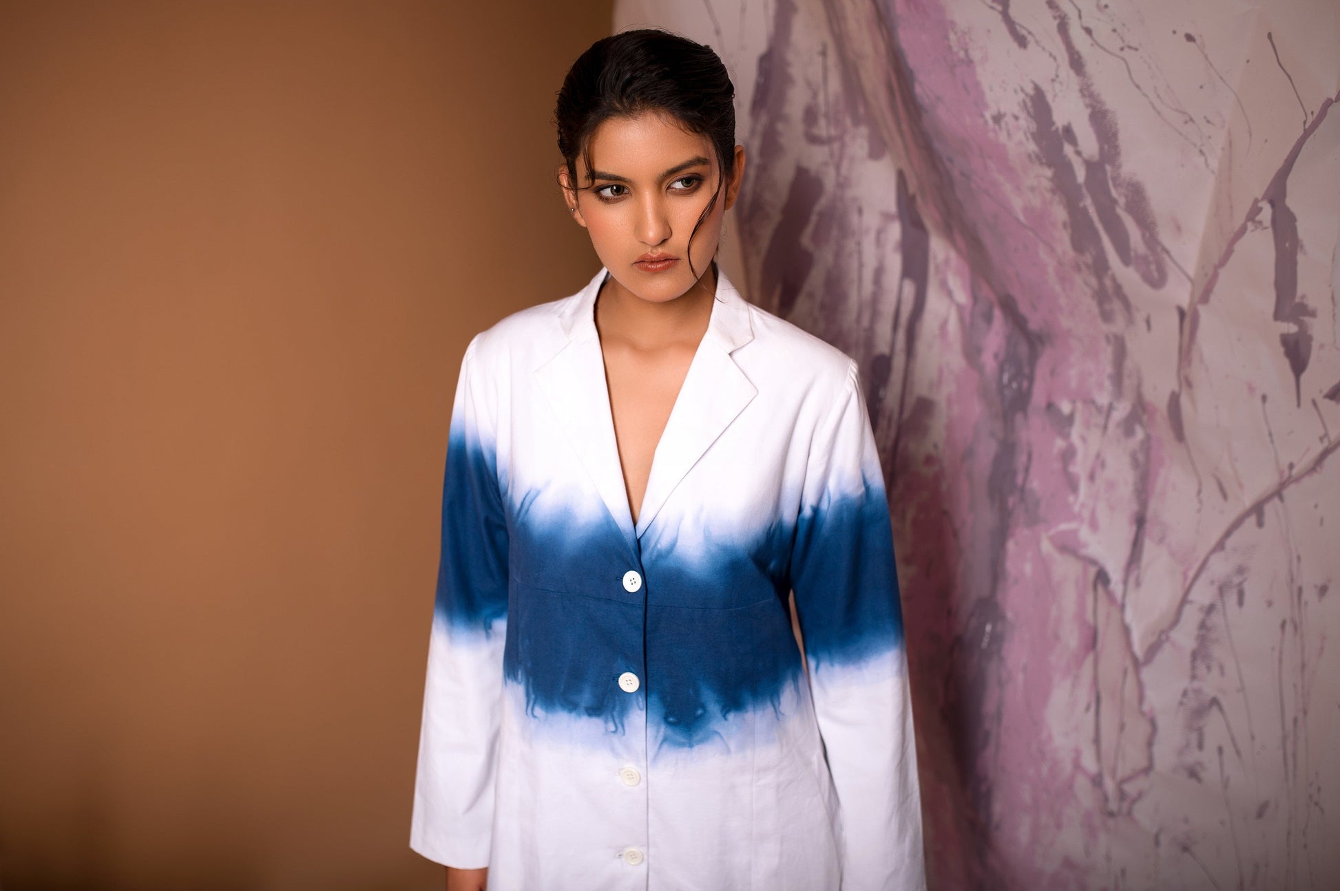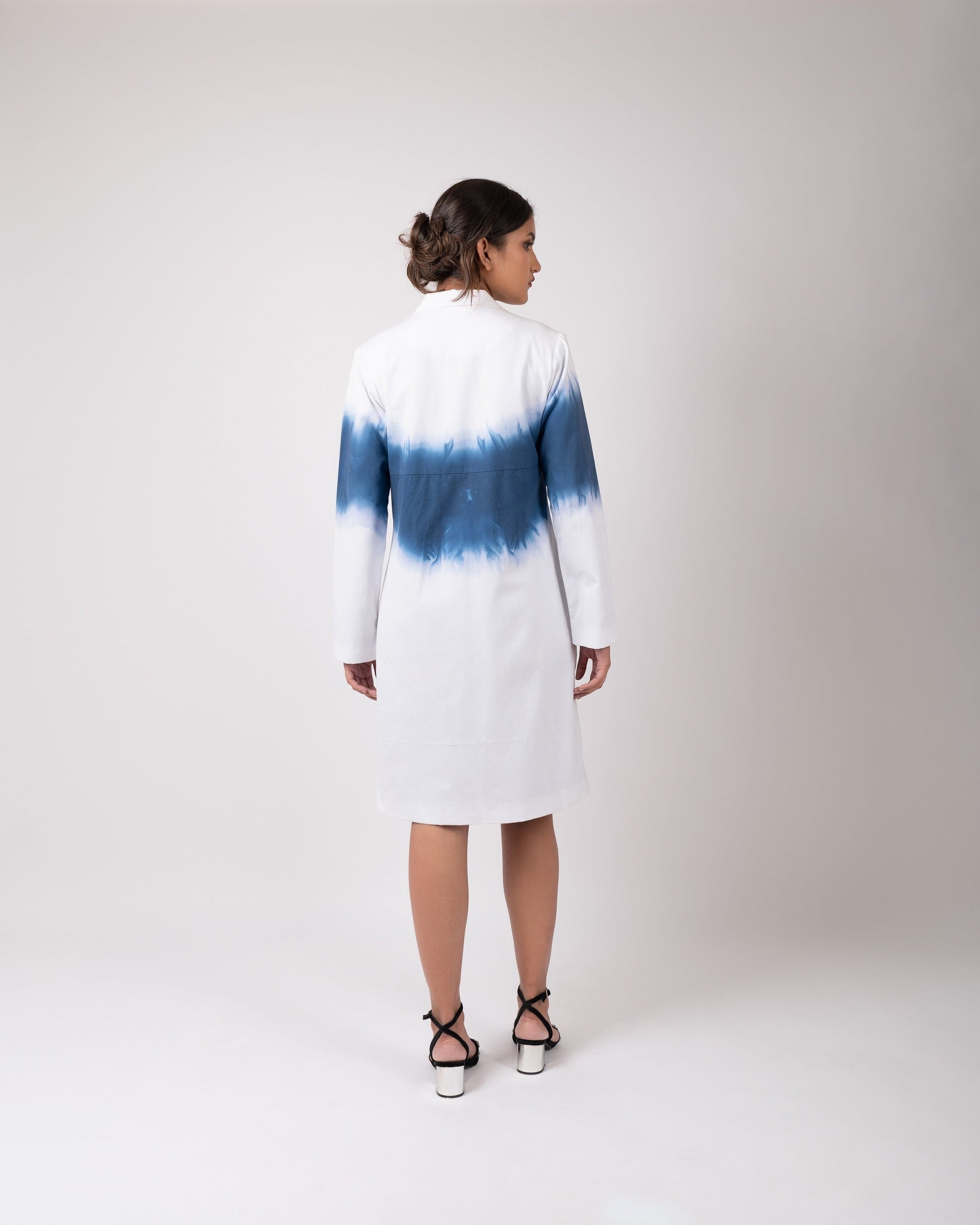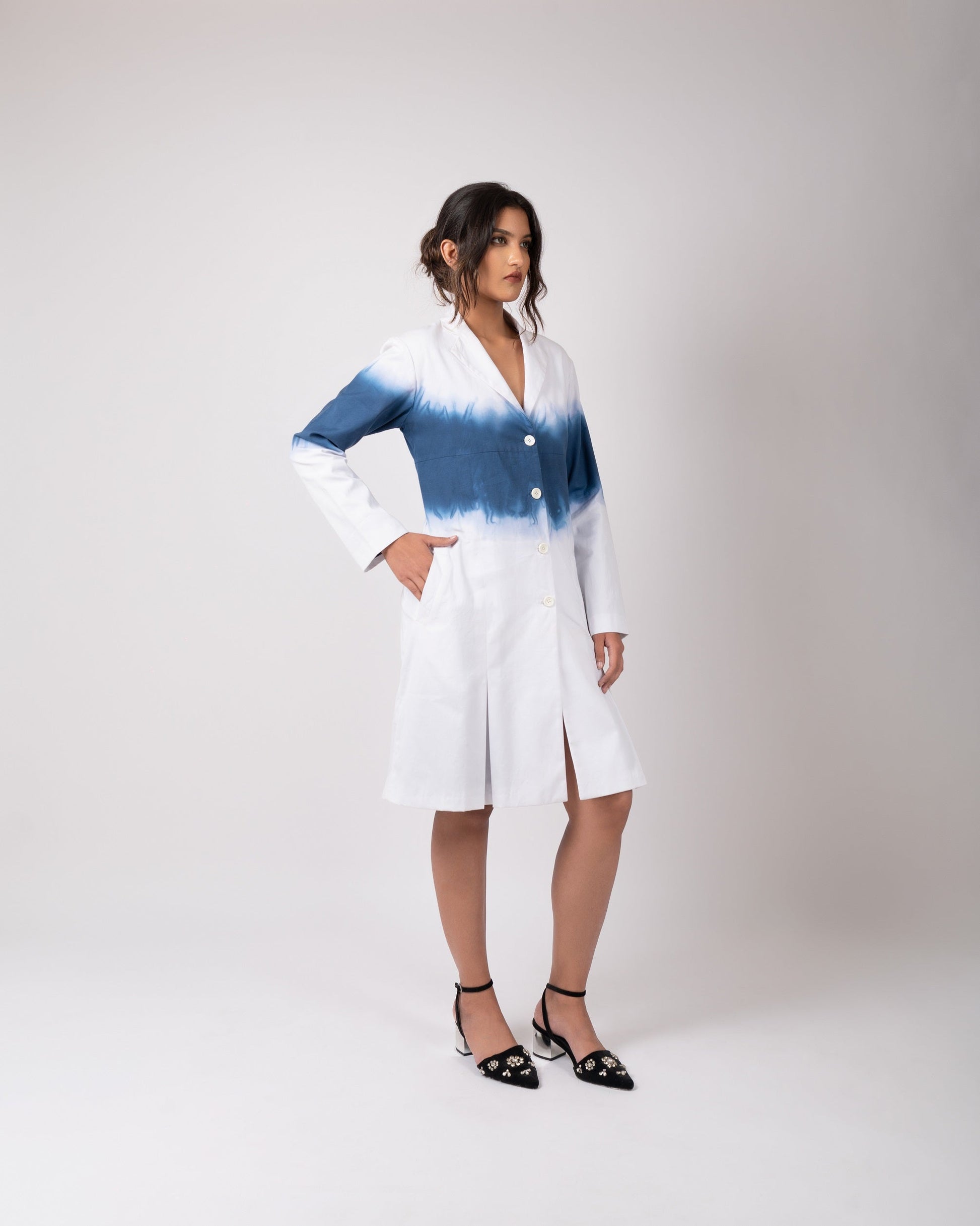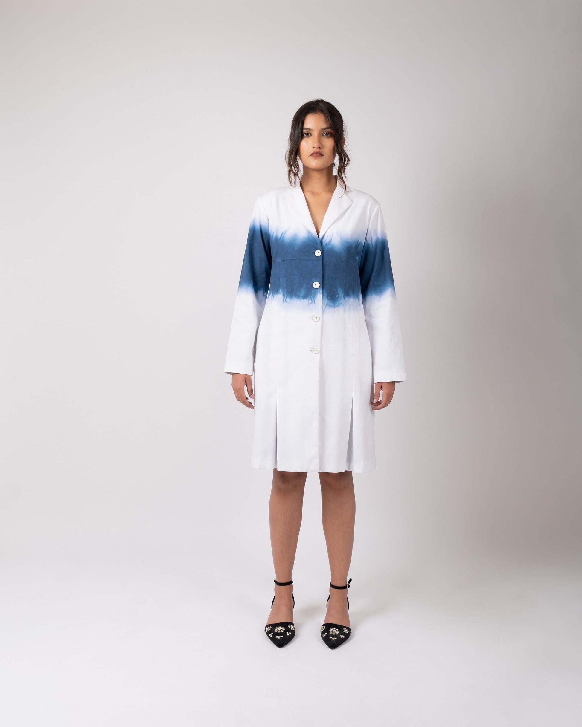 A knee length jacket, made out of organic oxford cotton, ombre dyed, lightly pleated with a peaked lapel collar and full sleeves.